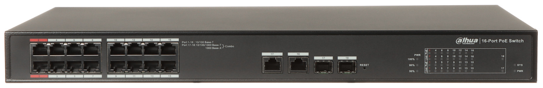 Porty LAN: 16 x RJ45 10/100 Base-T ( 2 x Hi-PoE (802.3bt) + 14 x PoE (802.3af/at) ),